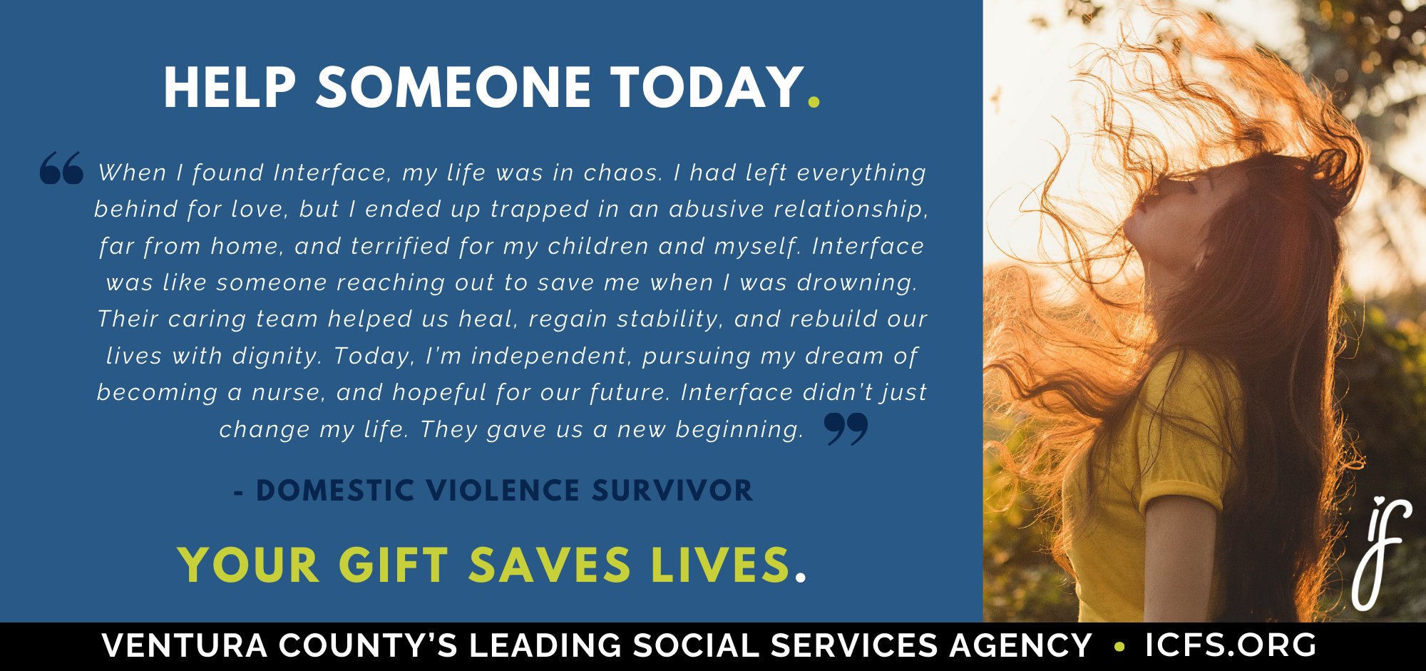At Interface Children & Family Services, we’re focused on making sure every child, teen, parent, and adult in our community has every opportunity to thrive. Founded in 1973, Interface is Ventura County’s most comprehensive nonprofit provider of social services, including mental health & trauma treatment, youth crisis & homeless services, domestic violence & child abuse prevention, human trafficking prevention & intervention, and justice services.